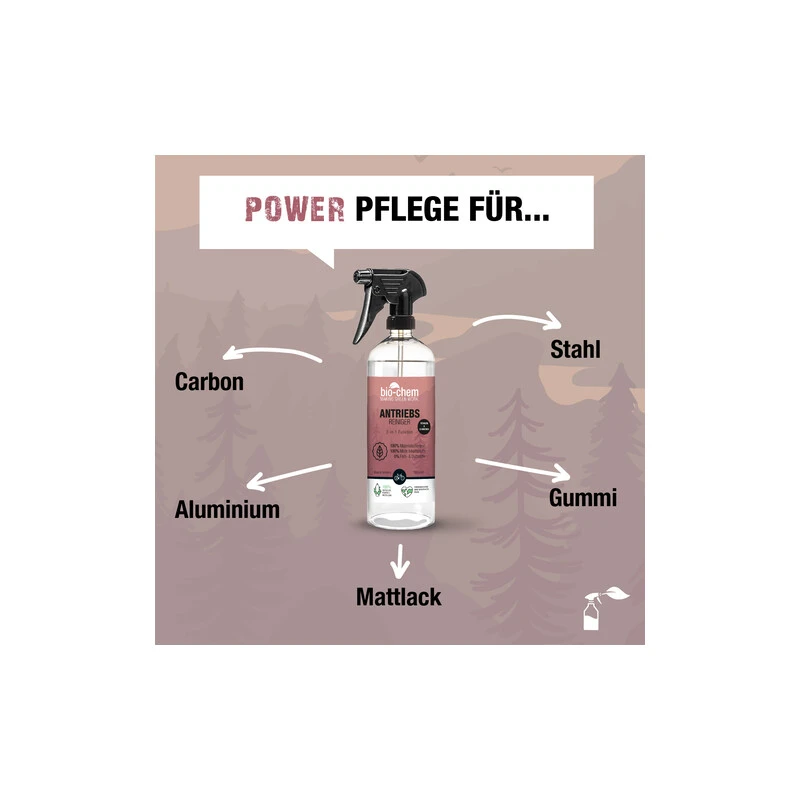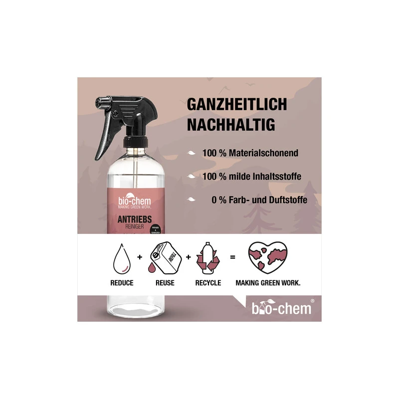 Freunde des aktiven Radsports aufgepasst! Vorbei mit zeitaufwendigem und nervigem Reinigen und Schmieren der Fahrradkette! Mit dem bio-chem Antriebsreiniger reinigst und schmierst du deine Fahrradkette und das Kettenritzel in einem Schritt umweltfreundlich und effizient. Das Mittel riecht dabei nicht streng und ist natürlich kein bisschen aggressiv so wie es viele herkömmliche Kettenreiniger sind. Trotzdem ist der bio-chem Antriebsreiniger extrem wirkungsvoll und auch auf Aluminium bedenkenlos verträglich.