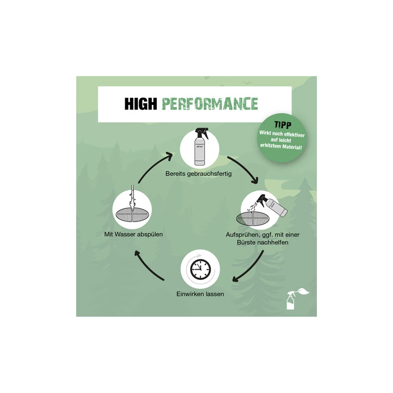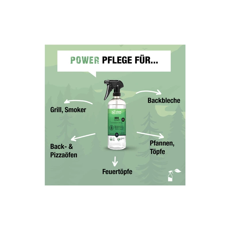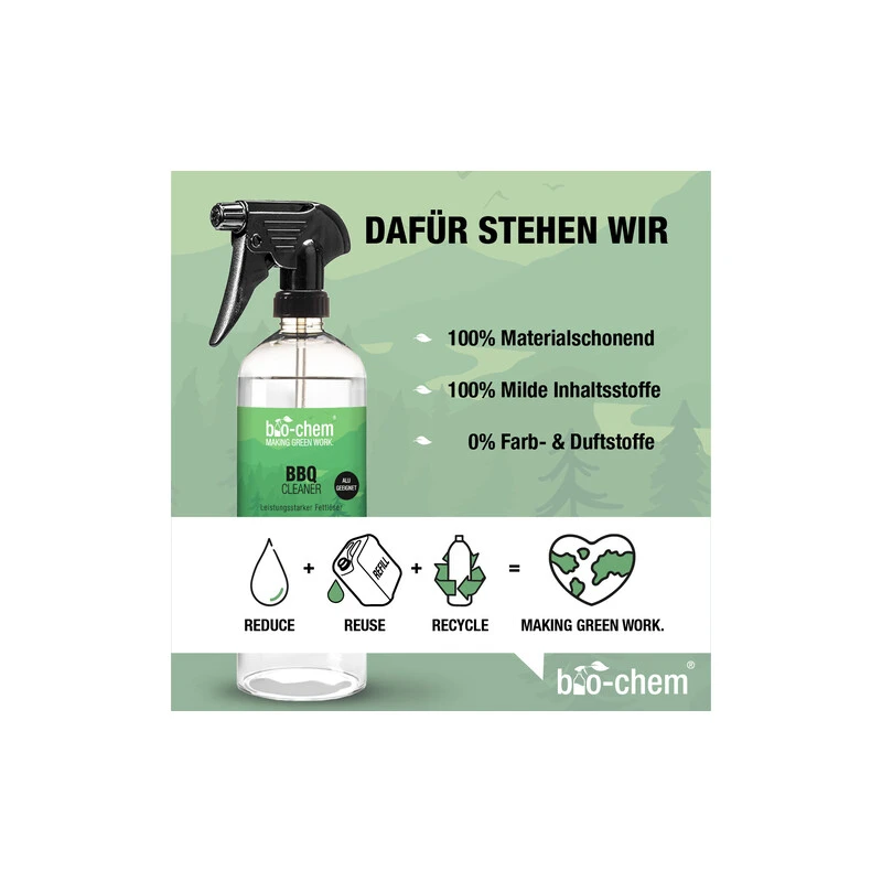 Endlich ein Reiniger mit dem du dank 100 % biologisch leicht abbaubarer Inhaltsstoffe deinen Grill abspülen kannst, ohne der Umwelt oder deinem Garten zu schaden. Der bio-chem® BBQ-Cleaner wurde speziell für alle Grillarten und deren empfindlichen Oberflächen entwickelt. Er entfernt restlos Verschmutzungen wie eingebrannte Fette, Öle, Eiweisse und sorgt dabei für strahlende Ergebnisse. Nach ein paar Minuten Einwirkzeit kannst du deinen Grill von Fett und weiteren Schmutz befreien. Und das ganz ohne grossen Kraftaufwand.