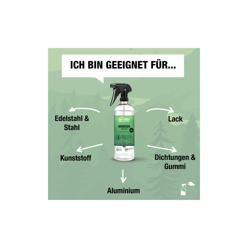 Mit dem Bio-chem Bremsenreiniger entfernst Du effizient schmutzige, ölige und fettige Ablagerungen auf verschiedensten Oberflächen auf Deinem Fahrrad, Auto oder Motorrad. Der Bremsenreiniger beseitigt dabei mühelos Öle, Fette, Russ, Schleif- & Bremsstaub, Abrieb und weitere Trennmittel von deinen Bremsen, Motor oder Kette.