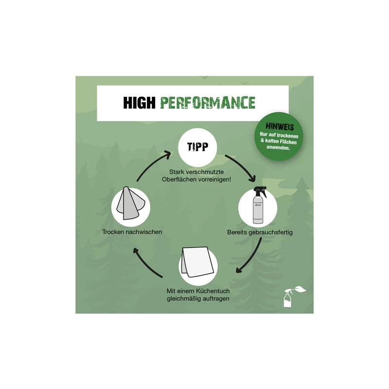 Der Edelstahl-Reiniger hinterlässt keine Rückstände oder schmierige Stellen, sondern nur sauberen Glanz! Wenn Du eine Edelstahlarbeitsplatte oder Edelstahlgeräte besitzt, weisst Du genau, wie diese nach dem Kochen aussehen können. Spüli und Wasser helfen da garantiert nicht weiter. Mit der Edelstahl-Pflege macht das Sauberhalten in der Küche wieder Spass. Es entstehen keinerlei Streifen, sondern ein haftender Schutzfilm. Der Schutzfilm hält die Oberfläche lange sauber und schützt vor Fingerabdrücken oder anderen unschönen Flecken.