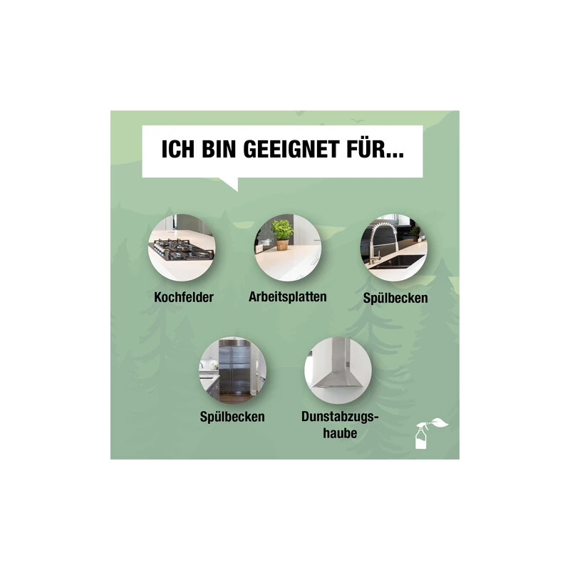 Liegt Dir die Umwelt und Nachhaltigkeit vor allem beim alltäglichen Putzen am Herzen? Dann ist dieser Küchenhelfer aus biologisch leicht abbaubaren Wirkstoffen genau der richtige Reiniger für Dich. Er ist frei von Duft-, Farbstoffen und kennzeichnungspflichtigen Inhaltstoffen und besitzt trotz seiner milden Formel eine sehr starke Reinigungskraft. Du kannst den Reiniger überall in der Küche anwenden und hinterlässt dabei keine Schlieren. Ob auf den Arbeitsflächen, Ceranfeld- oder Induktionsfeld, Schrankwände oder Essenstisch – Deine Küche wird es Dir mit einer strahlenden Sauberkeit danken.