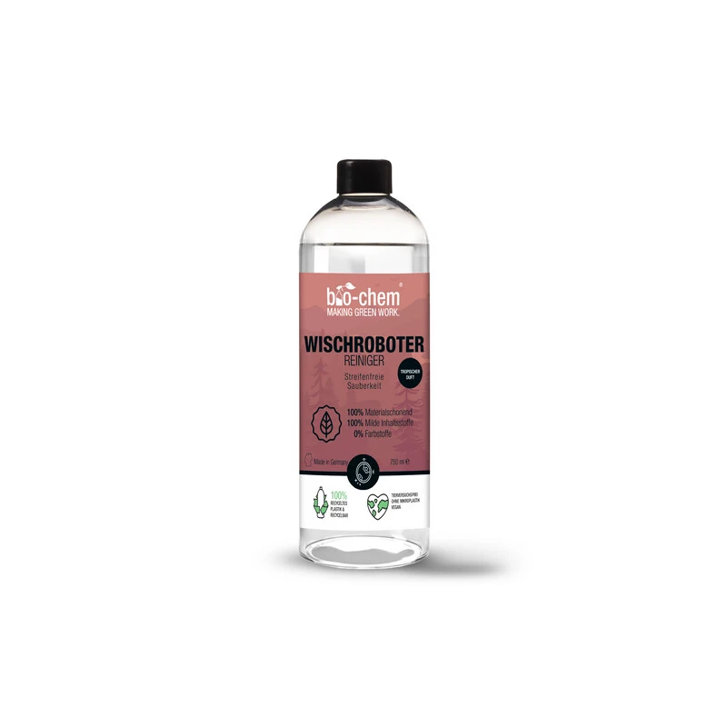 Der bio-chem Reiniger für Wischroboter bietet Dir alles, was du Dir von einem sehr gründlichen Reinigungsergebnis wünschst. Das Reinigungsmittel entfernt selbst hartnäckige Flecken und es entsteht ein angenehmer, aber keineswegs aufdringlicher Duft. Auf dem Boden bilden sich bei der empfohlenen Dosierung keinerlei Schlieren. Der Reiniger ist dabei sehr ergiebig und schäumt nicht! Wenn Du glaubst, dass Dein Wischroboter bisher schon gut lief, wird das bio-chem Reinigungsmittel auch die letzten Prozente aus Deinem Gerät herausholen. So strahlen deine Fliesen, Laminat oder Parkett wieder frisch und sauber.