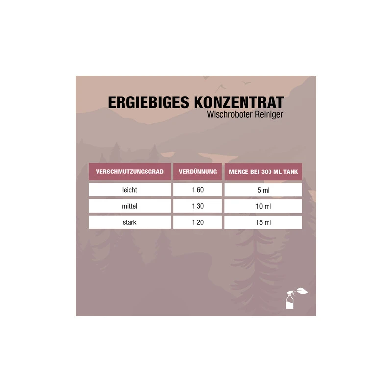Bei der von uns empfohlenen Dosiermenge reicht die Flasche bei einem handelsüblichen Wischrobotertank für bis zu 150 Anwendungen aus. Das sind keine 8 Cent pro Anwendung für ein hervorragendes Wischergebnis.