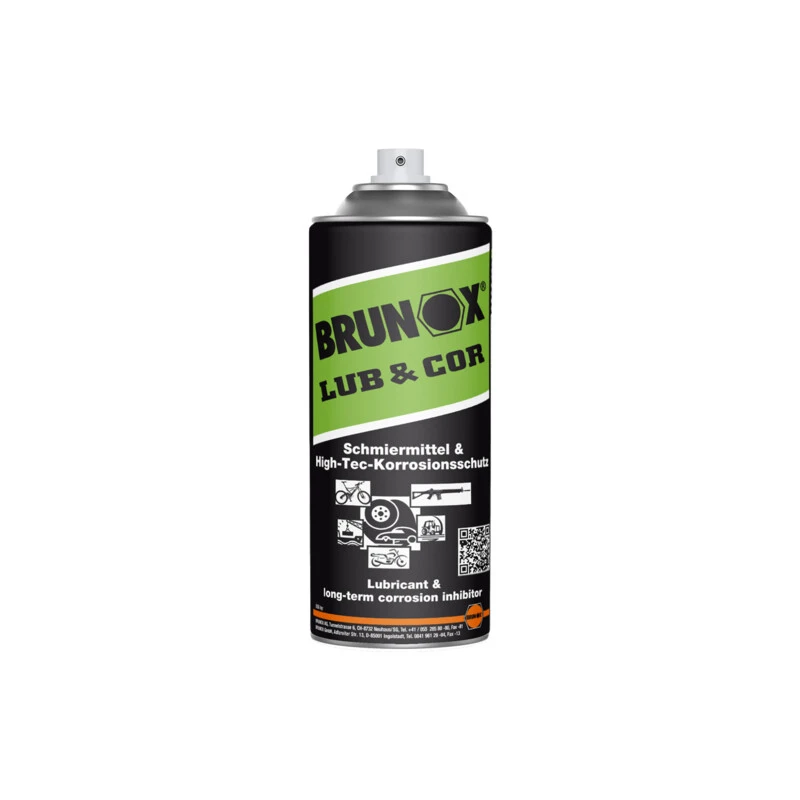 Brunox Lub & Cor Multifunktionsschmiermittel, das am Fahrrad, vor allem an der Kette und bei Schalt- und Bremszügen, angewendet werden kann. Dort ist es ein lang wirkendes Schmier- und Korrosionsschutzmittel, das dank hervorragender Kriecheigenschaften auch in die schmalen Zwischenräume der Kette eindringt.