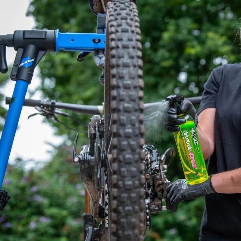 Muc-Off’s „Bio Drive Train Cleaner“ ist die Antwort für alle schmutzigen, verklebten und verschmierten Antriebseinheiten! Er wird einfach auf die Kette, Umwerfer, Ritzel und Schaltung aufgesprüht. Danach lässt man den Antriebsreiniger 3-5 Minuten einwirken. Hartnäckigen Schmutz am besten mit der Detailing und Claw Brush bearbeiten und anschließend einfach abspülen. Er ist biologisch abbaubar und dadurch harmlos für die Umwelt. Kann in Kombination mit dem „X3 Chain Cleaning Device“ verwendet werden in dem man den Antriebsreiniger in das dafür vorgesehene Reservoir einfüllt.